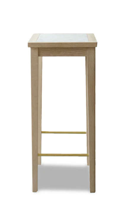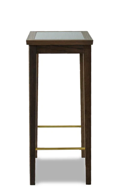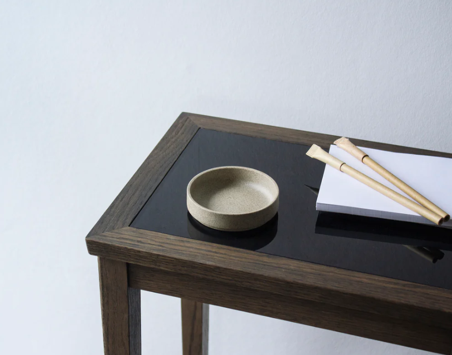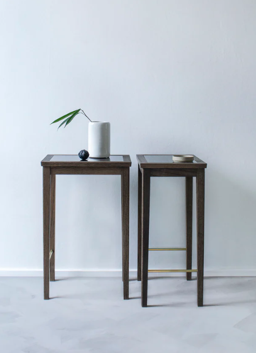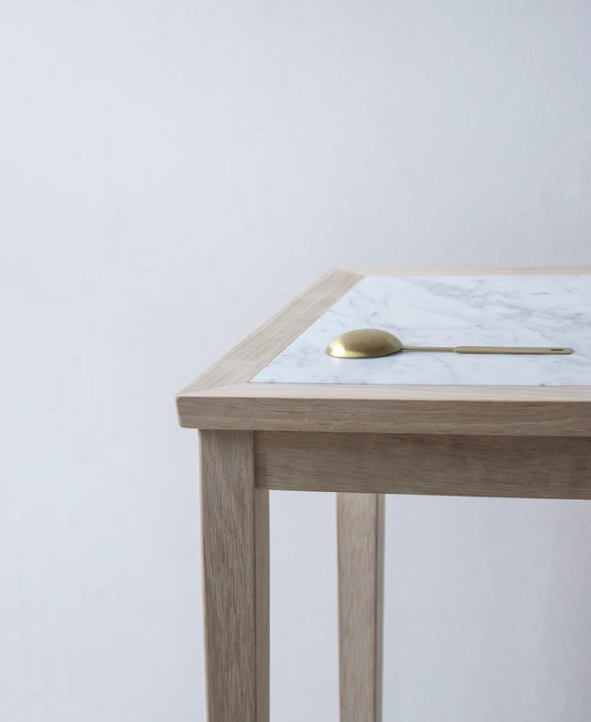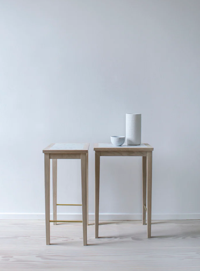 Originally, the side table was made with a black glass plate in the centre of the table top, emphasising the minimalist design. Today, the tabletop is also available in white marble and soap finish that complement the wooden structure.