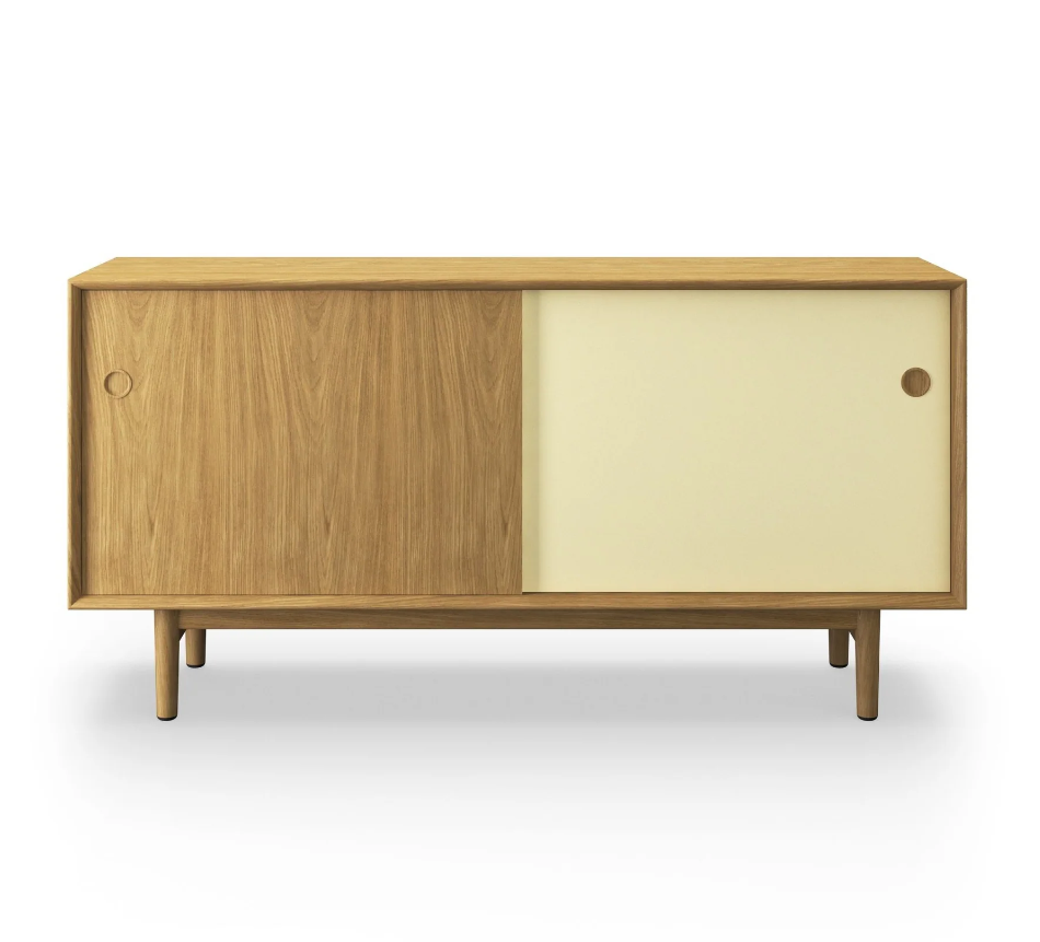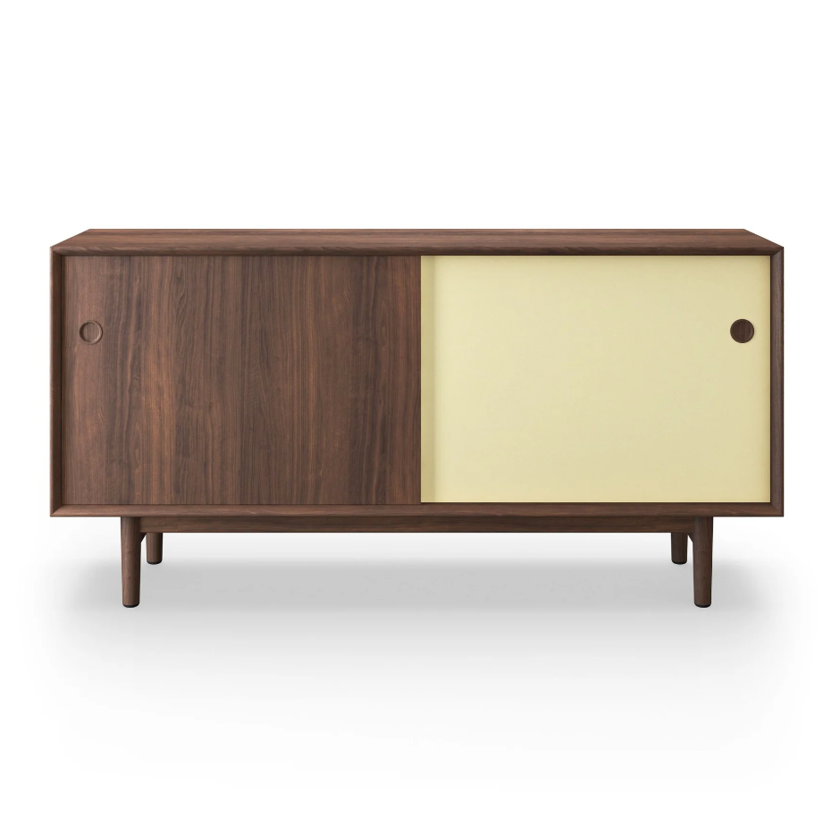 The Sibast No 11 sideboard is made of solid wood with oak and walnut veneer. It has reversible doors with colored surfaces on one side and wood on the other. Available in yellow, white, blue and black. Wood and steel legs.