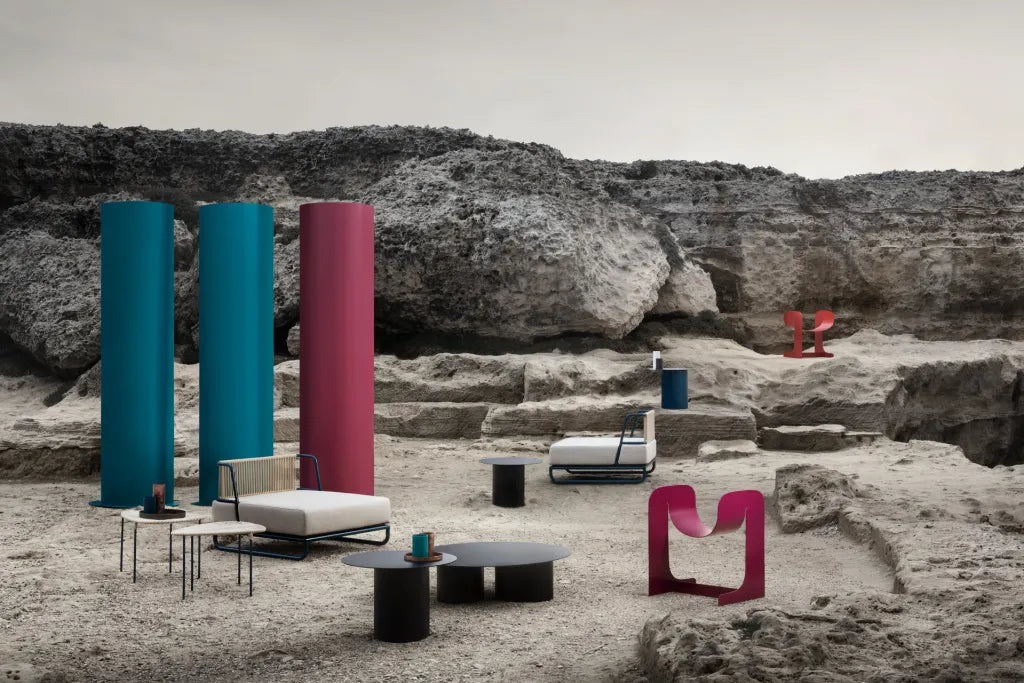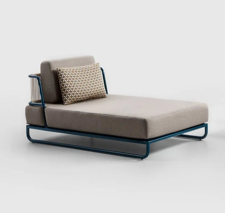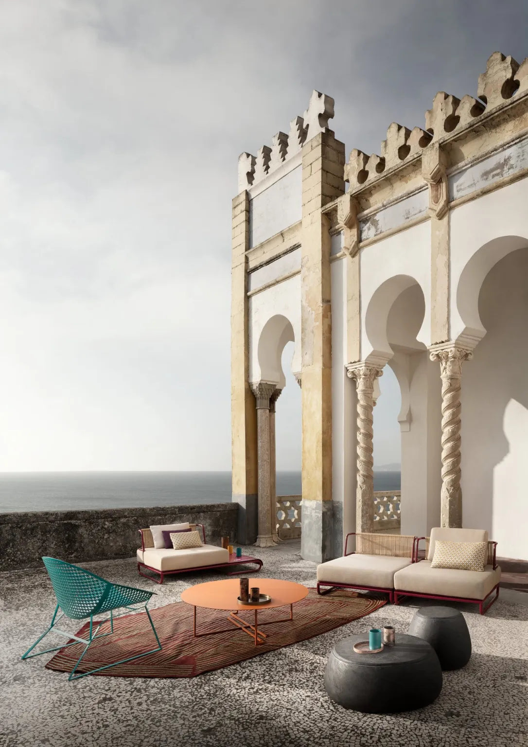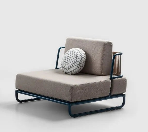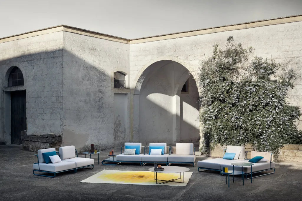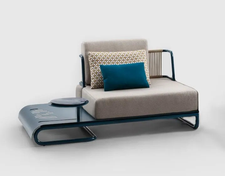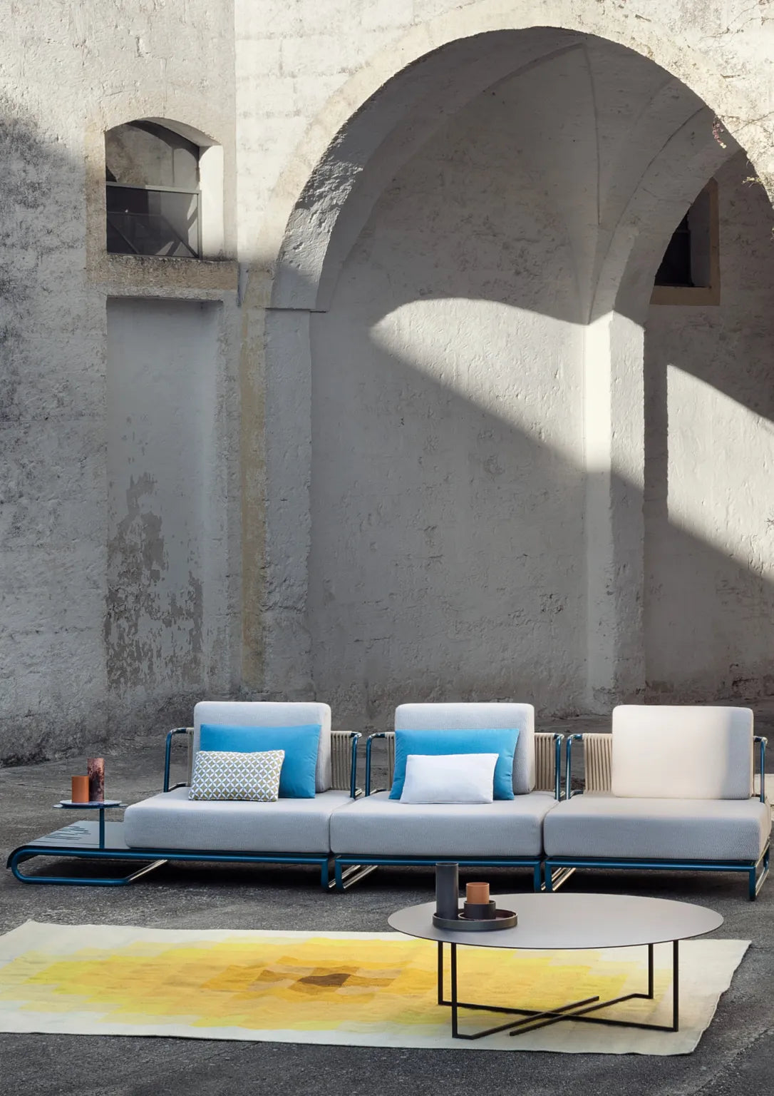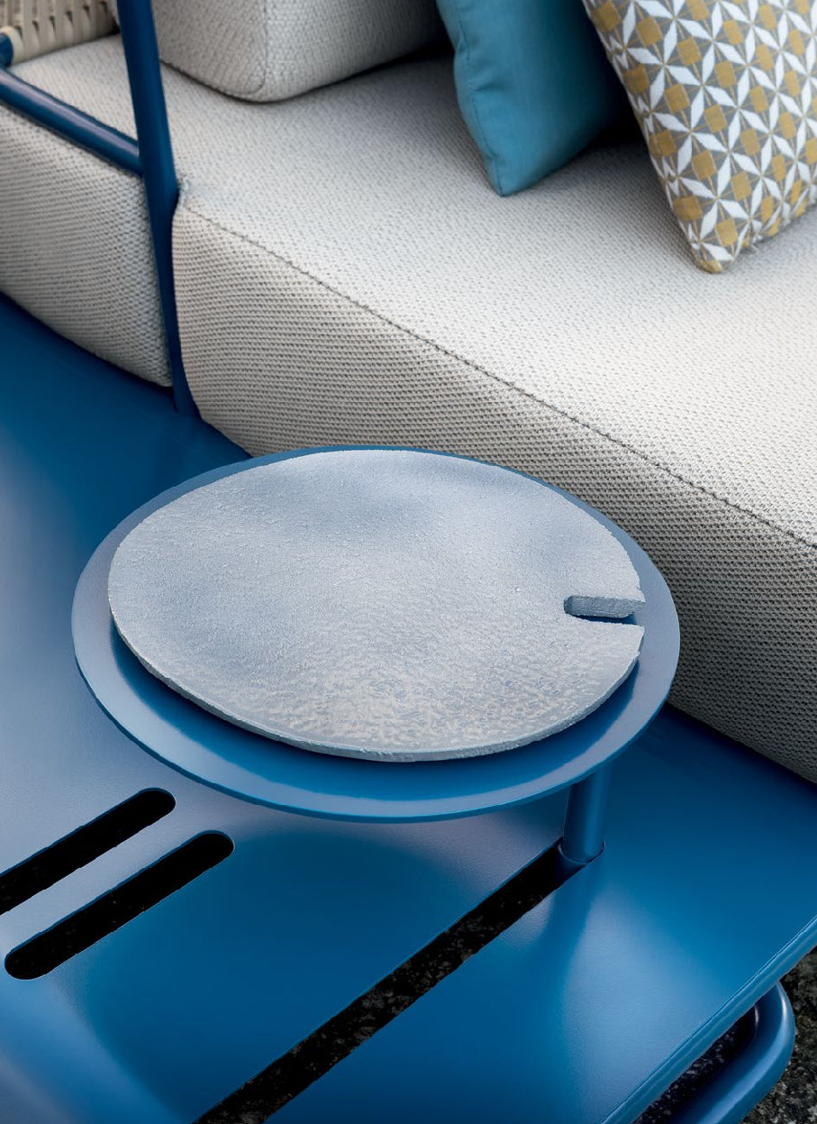 Indoor-outdoor modular sofa system, frame in curved stainless round steel tube, side extension in laser-cut and curved stainless-steel sheet with the possibility of inserting a small rotating table, accessorized with table-top ceramic tray. Seat webbing in elastic technical straps and seat cushion with draining Fly-Dry upholstery. Backrest realized in hand-braided technical cord