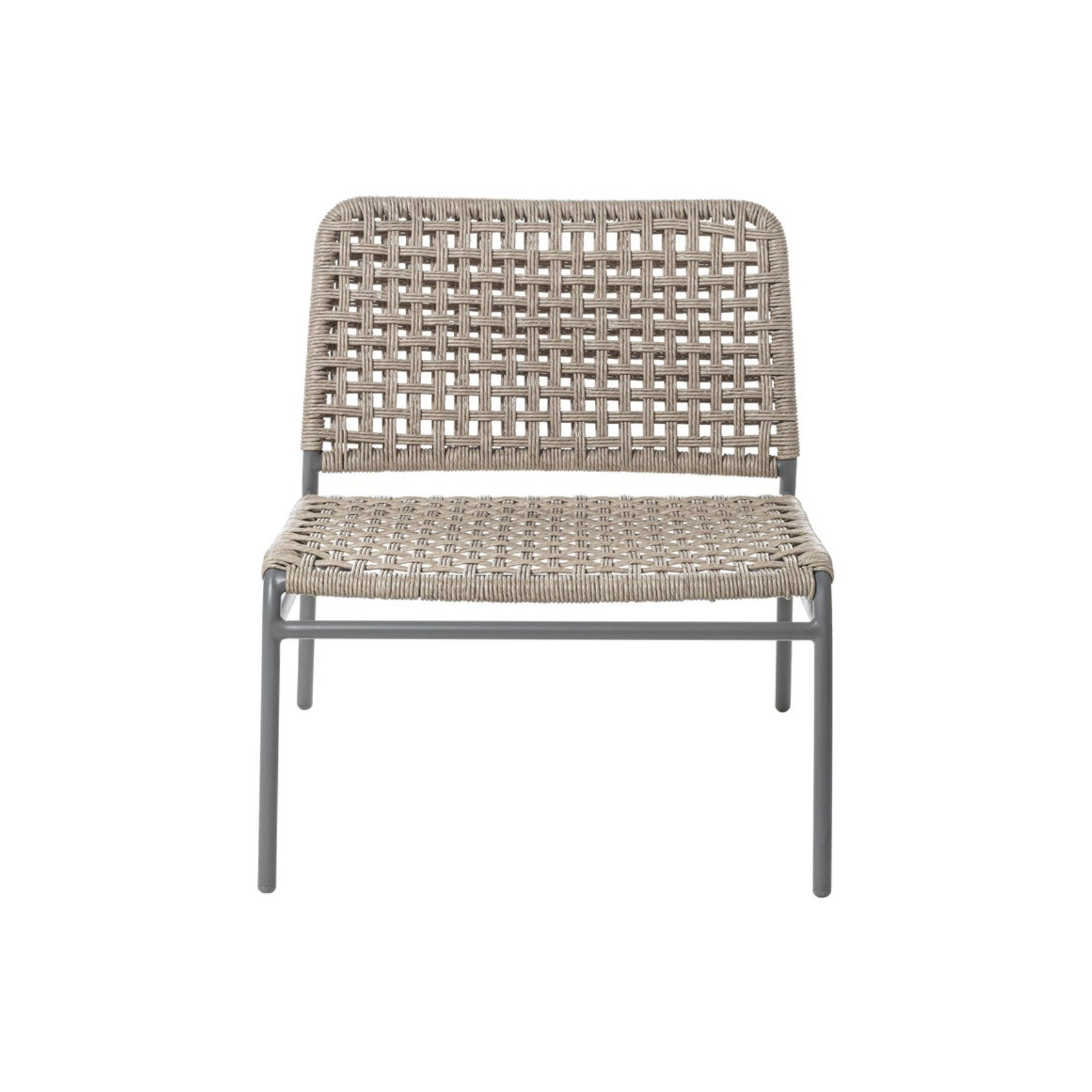 Simple and refined, the Straw 25 lounge chair is characterised by the structure in tubular aluminium painted light grey. A slender and light product covered with a handwoven weave with a double torsion polyethylene rope, a fibre with a natural, strong, flexible and durable appearance designed specifically for outdoor use. Lounge chair, light grey lacquered aluminium tubular frame, woven with Straw Resin fiber.