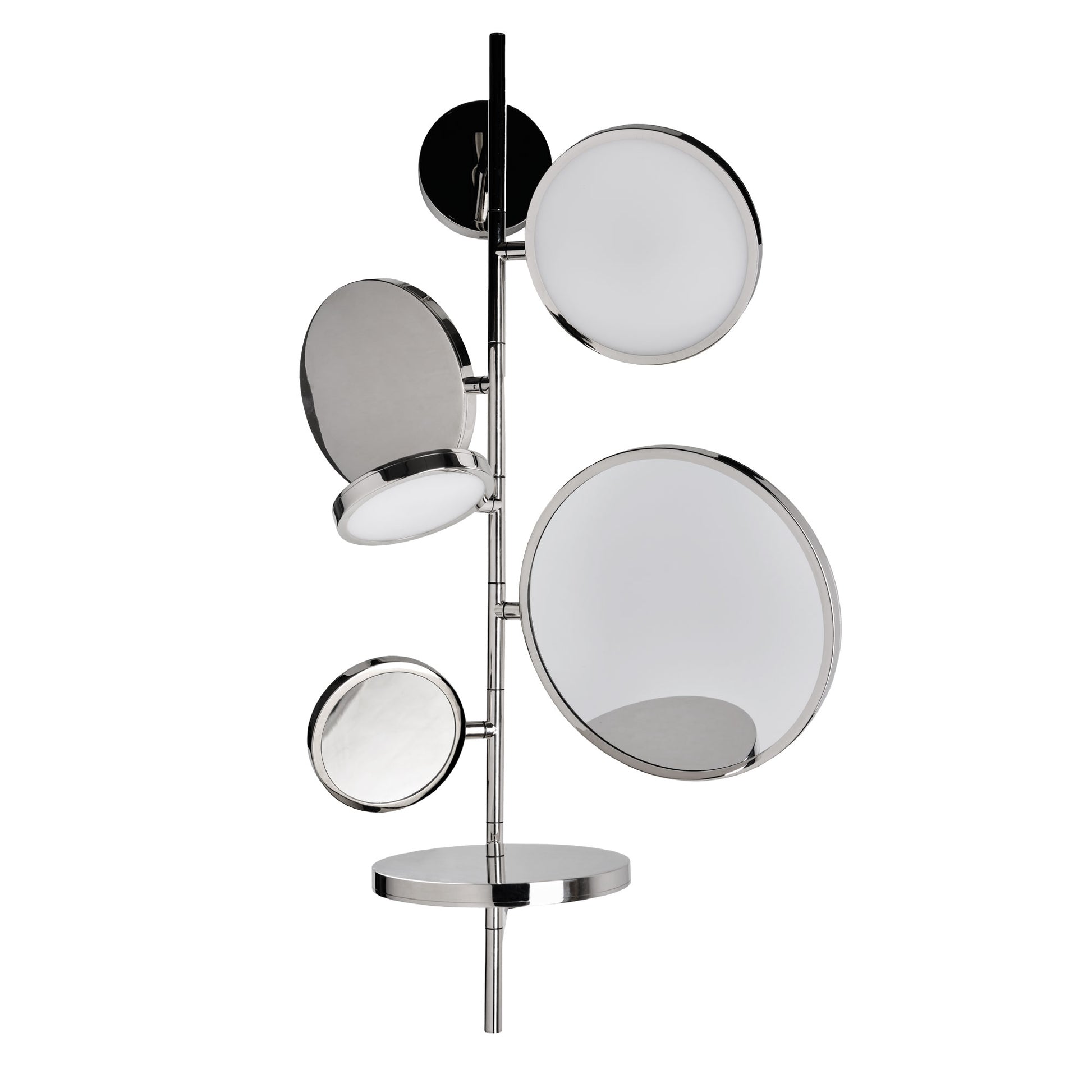 The Tell Me Stories Wall Sconce is a beautiful display of lines and circles that create a functional piece perfect for any bathroom or bedroom. It features two lights, two mirrors, and two shelves. Dimmable via Triac dimming.
