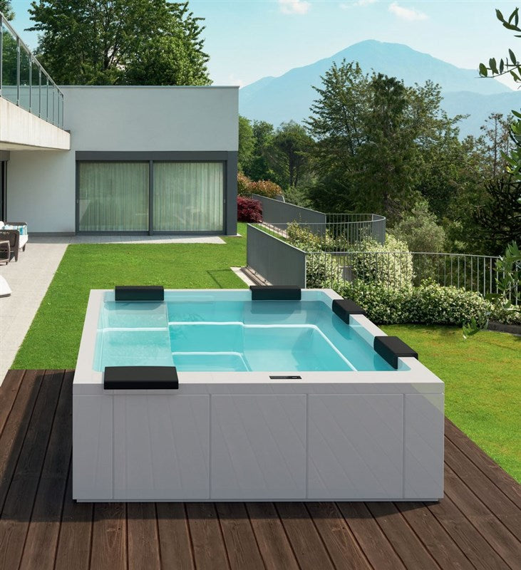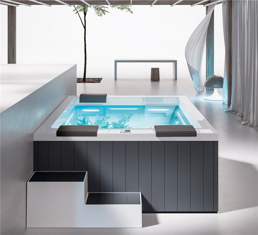 With dimensions of 260x205xH95 cm, Maya can be effortlessly installed either in indoor or outdoor settings, choosing between VTR paneling or a wood finish. The use of a thermal cover is always recommended for maintaining water temperature and protecting it from dirt.