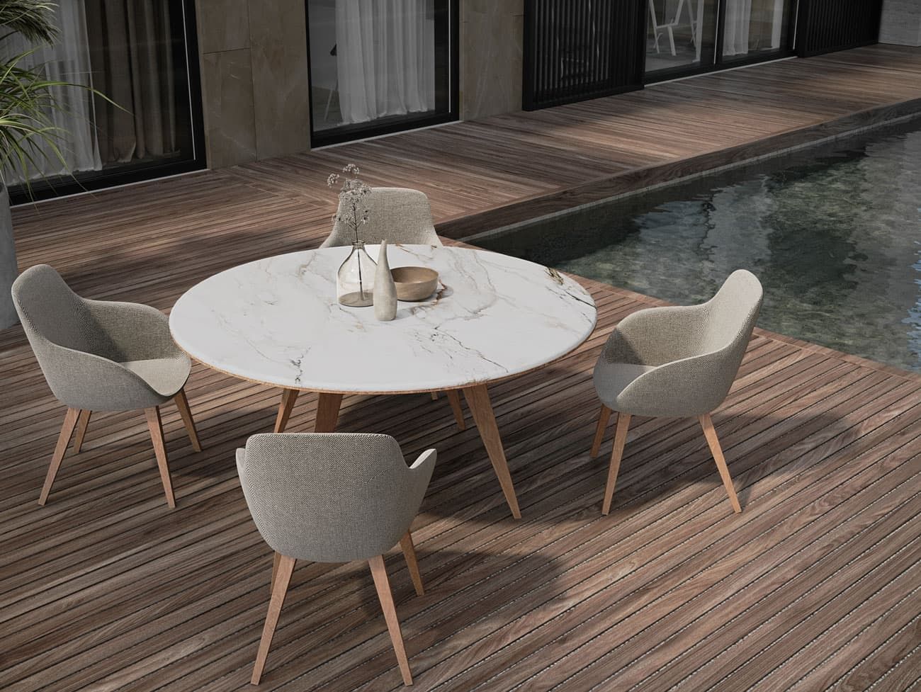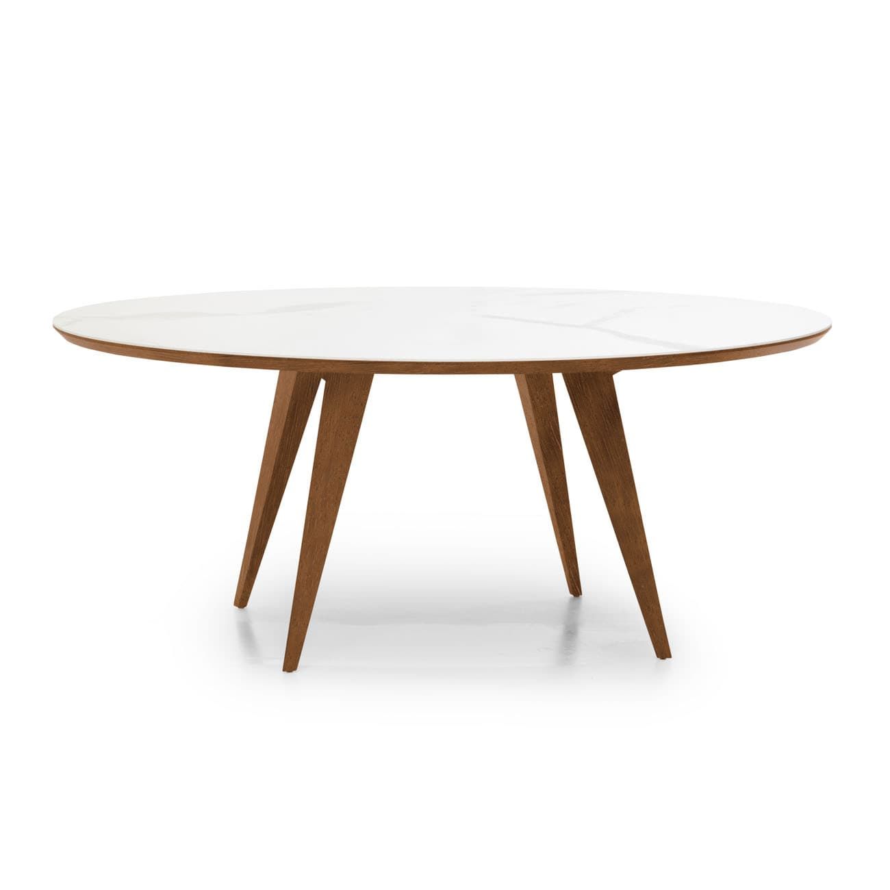 Top in marble Calacatta Paonazzo, legs and undertop in solid wood Iroko.