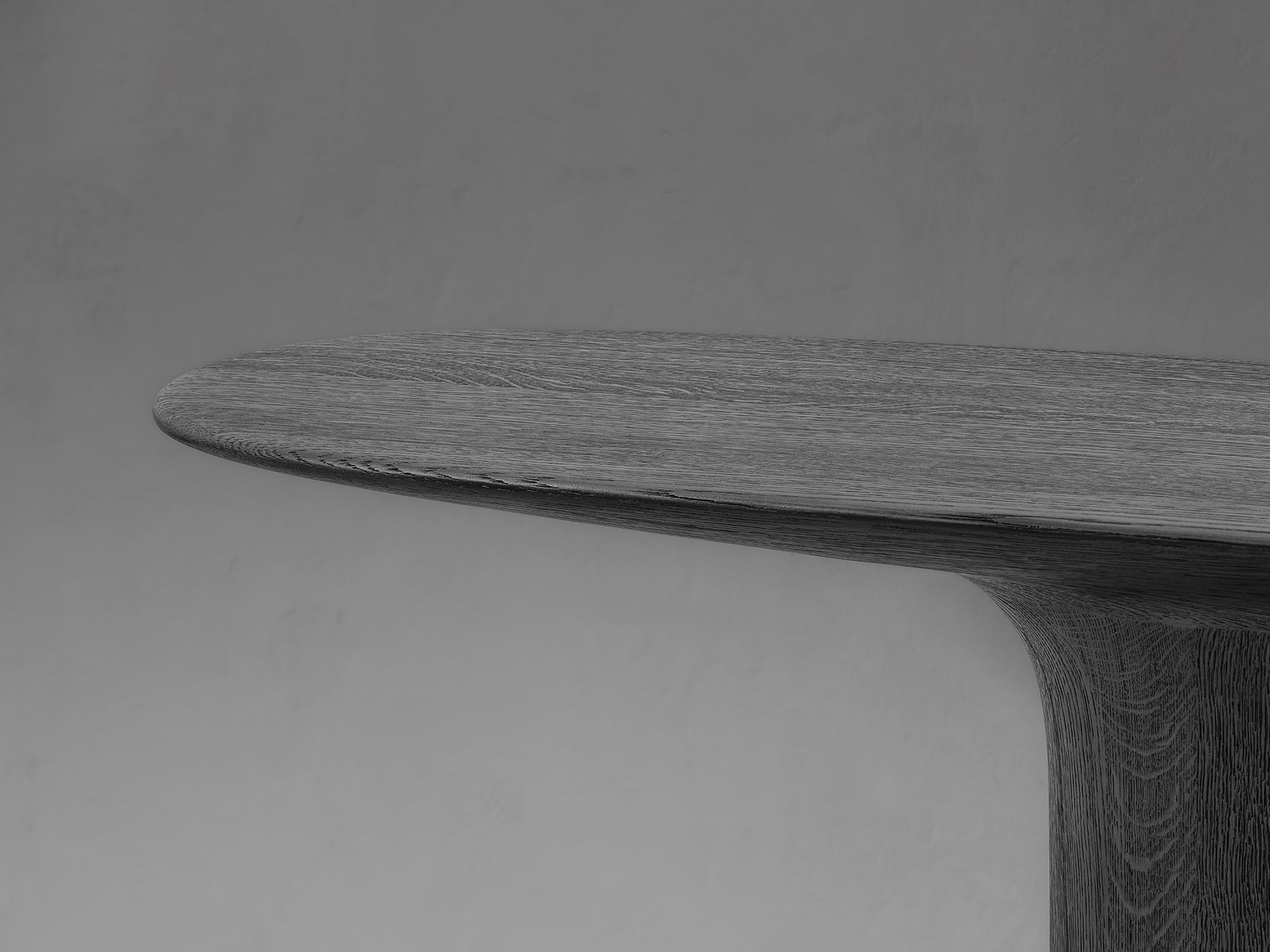 A solid wood console table with a thin, smooth oval top juxtaposed against a substantial base. Available in French oak. The design, inspired by a blacksmith’s anvil, incorporates a softly rounded and solid base that rises upwards and seamlessly transitions into a delicately elongated oval top, creating a powerful profile.