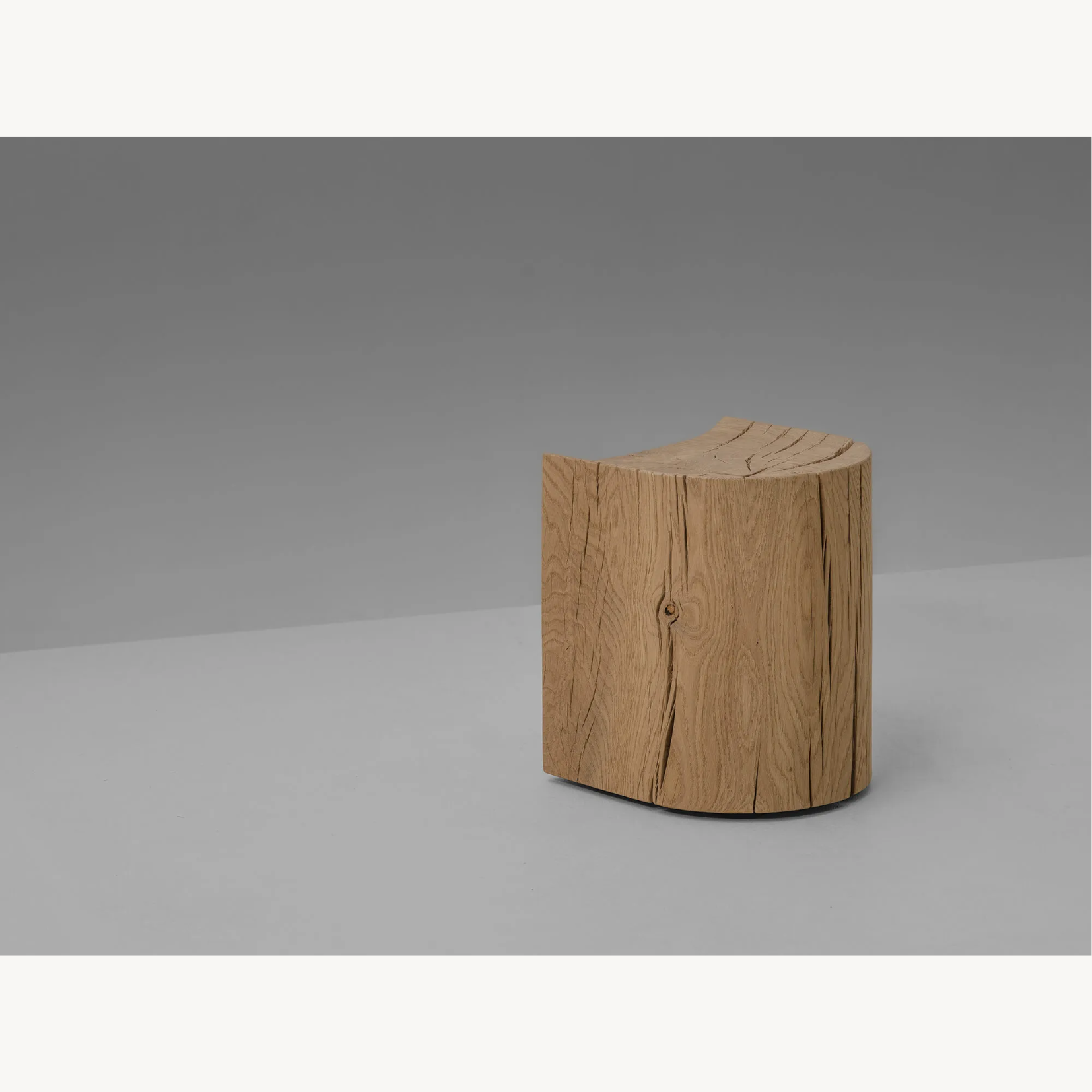 A bold stool with a raw, block-like form, where sharp angular edges meet rounded corners at the back. Available in French oak. The raw finish exposes the wood's inherent textures and grain, allowing the natural expressions of the material to subtly shape the piece's presence.