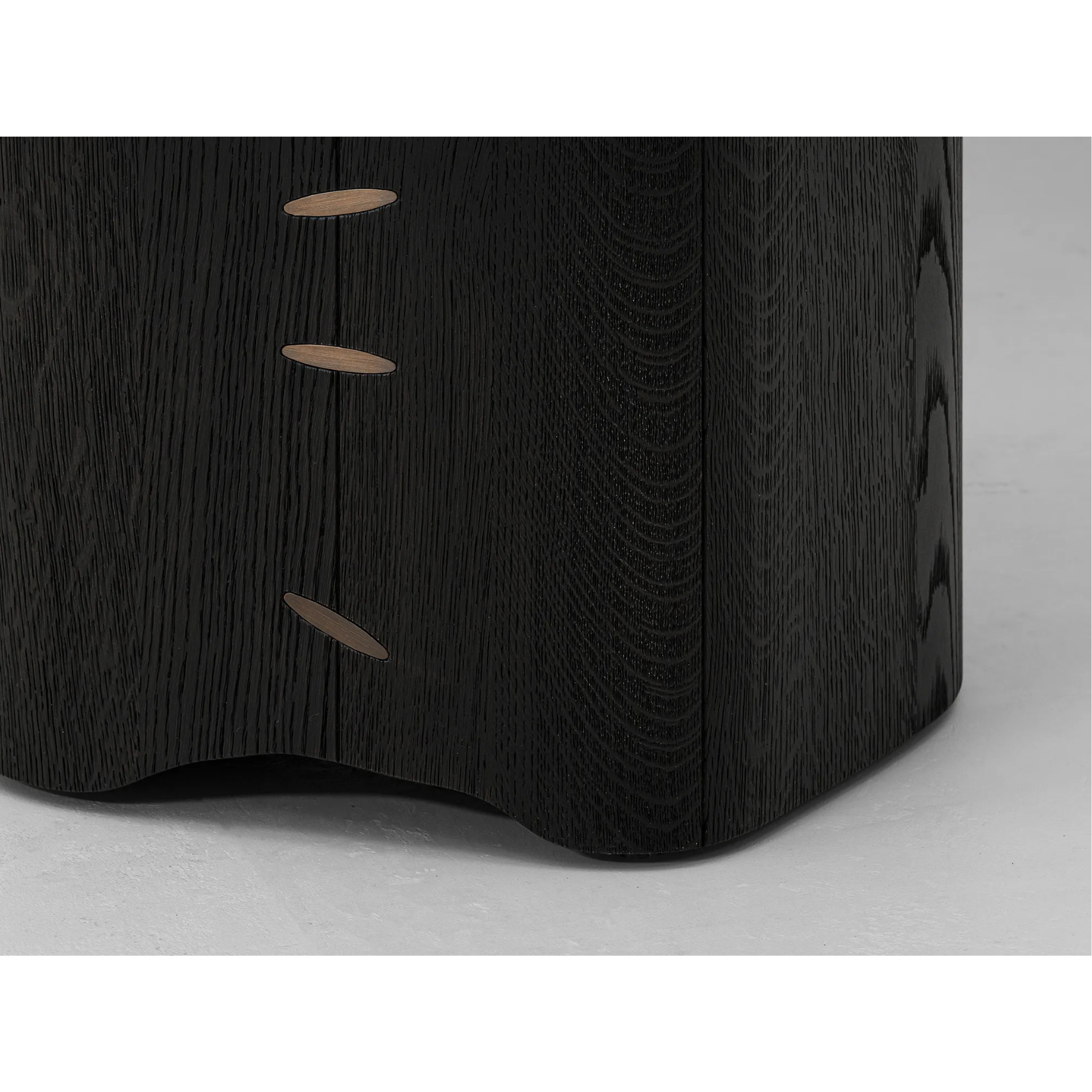 A compact, sculptural stool with an organic, irregular form that balances solidity with lightness. Available in brushed dark French oak, with patinated brass details. Its chiselled edges and sharp lines create a sense of geometry that is both deliberate and instinctive.