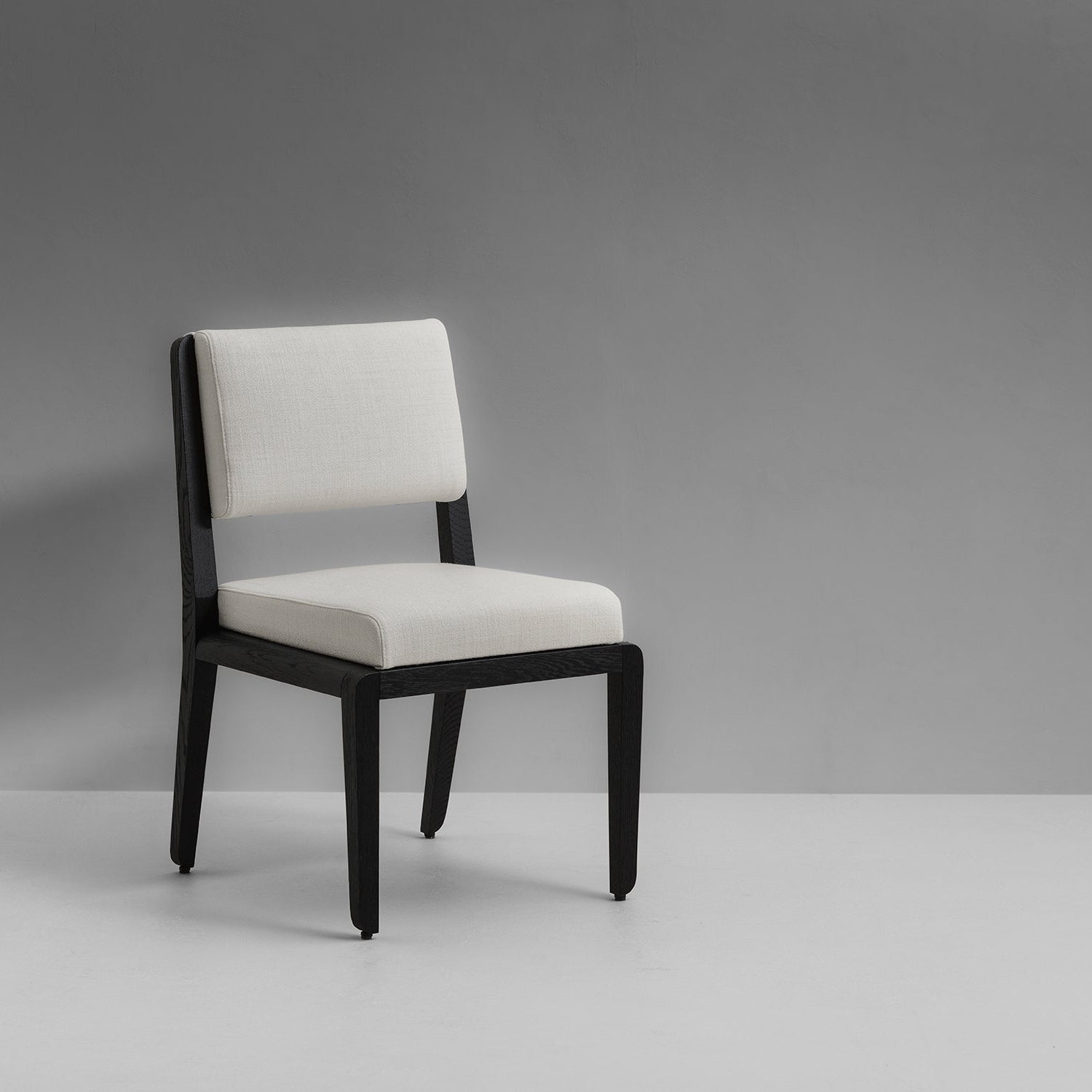 Side, desk, or dining chair in Van Rossum oak or walnut, upholstered in leather or a bespoke fabric finish. Gentle angles, rounded edges, with generous back and seat cushioning. Perfect posture.
