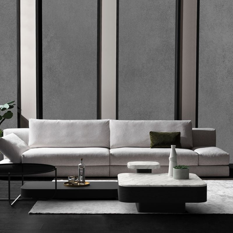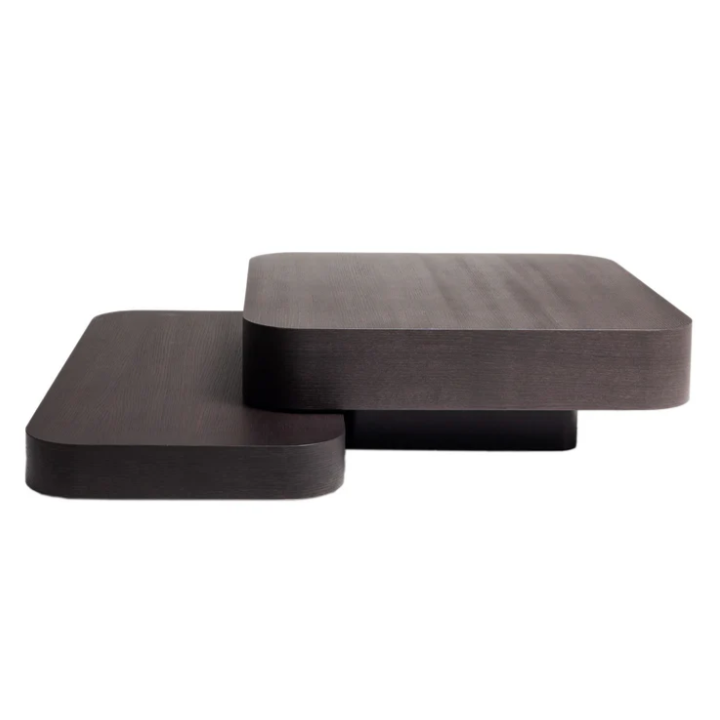 Squared volumes softened by generously rounded corners distinguish the bold look of this set of two accent tables. Perfect for complementing refined contemporary homes, it features a low rectangular table (120W x 60L x 13H cm) and a taller square table (90W x 90L x 32H cm), both fashioned of grey-stained oak and finished in an intense shade. The tables have detached frames allowing for separate displays. The square coffee table top is also available in different marbles.